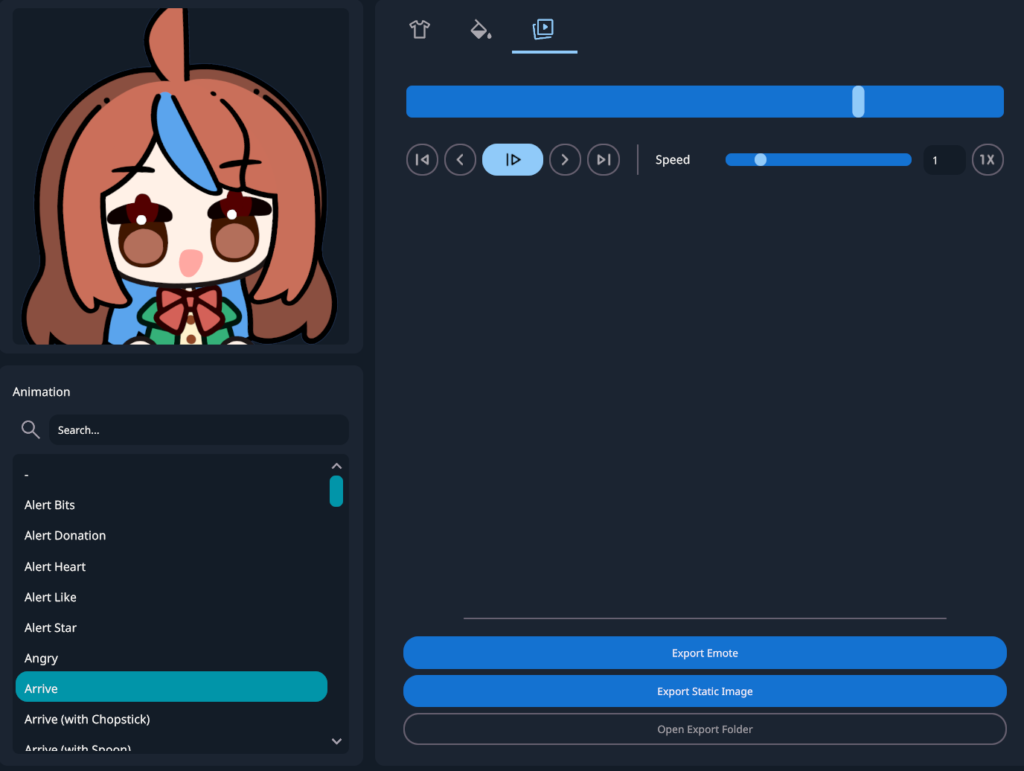 The playback tab allows you to pause and set the speed of the animation, and this is where you can export the emote as animated GIF or pause at a specific frame on the animation then export it as a static image PNG.