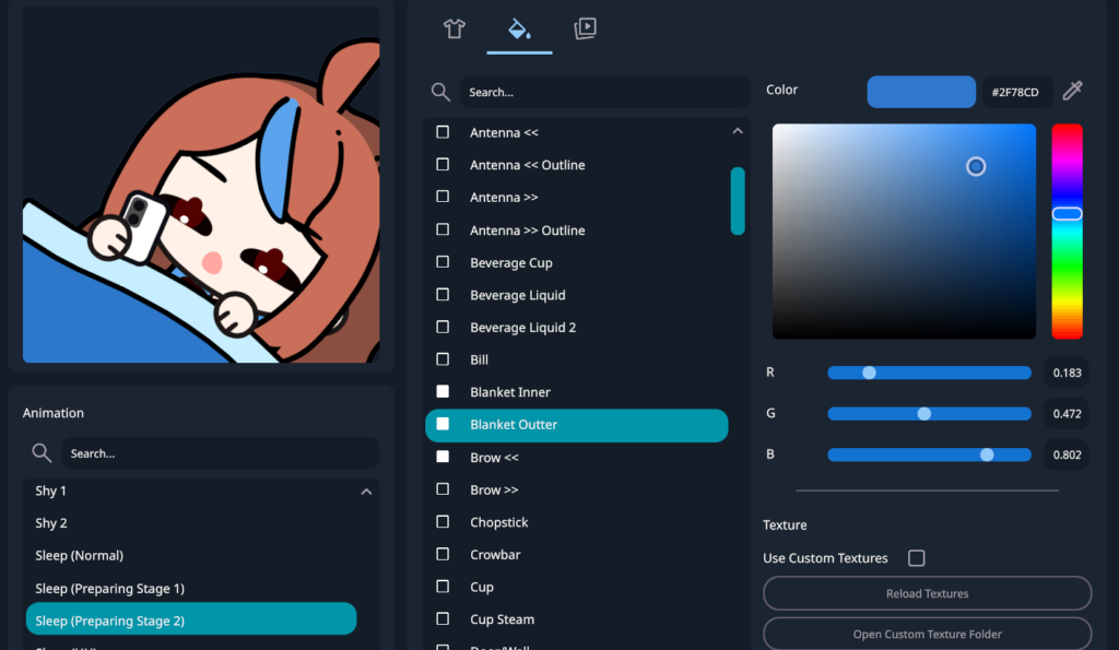 Besides part positions, you can also change colors of specific parts. There’s also an option to use gradients, and custom texture. If you need further customization or want to integrate your own style by drawing on the parts yourself, you can go tweak the texture images directly. So if your character have some details that is not available from the available part options, this is one way to make it closer to your design.
