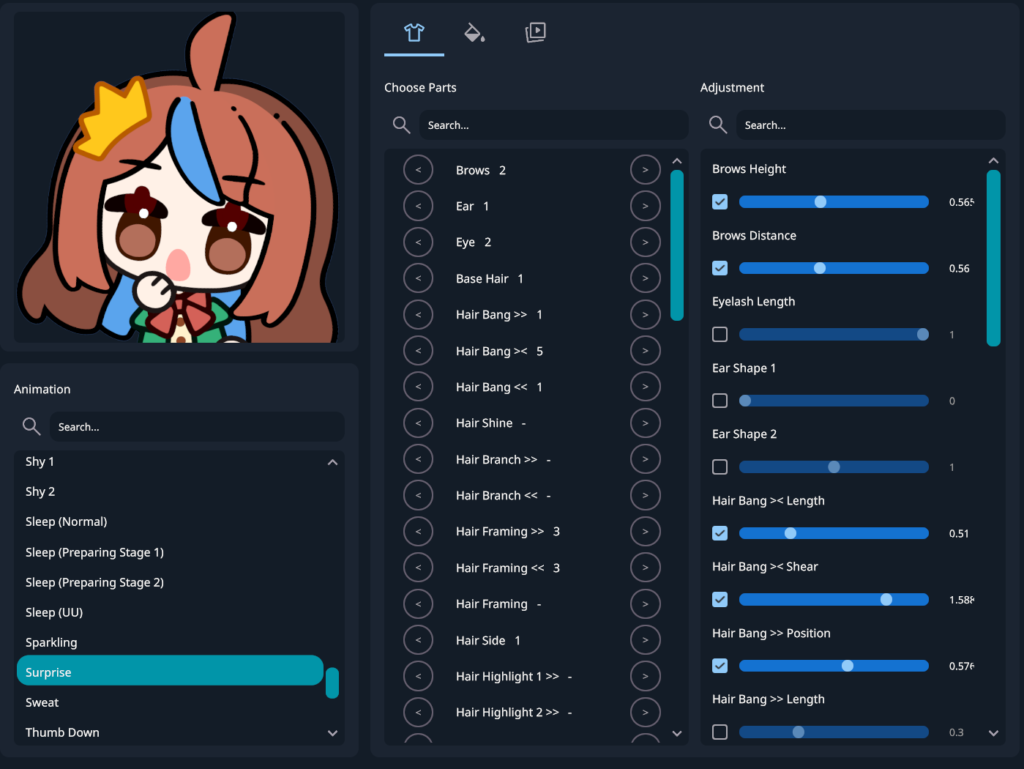 Parts & Adjustment: The first tab with the clothing icon is for opening options for customizing the character parts! You can adjust the position and size of the parts, like position of middle hair bangs or height of the eyebrow. Note that some parts are only seen in specific emotes, like prop items.