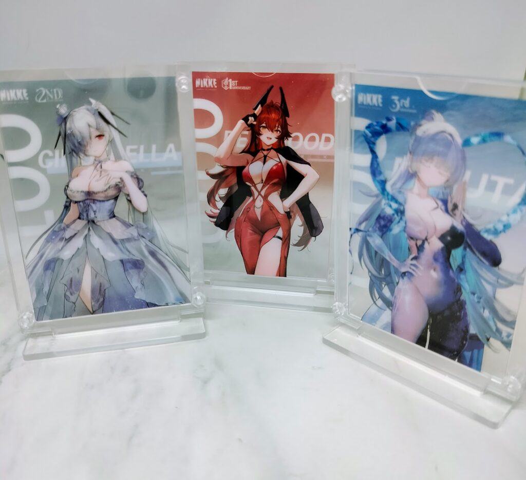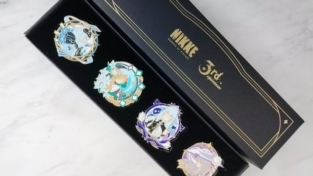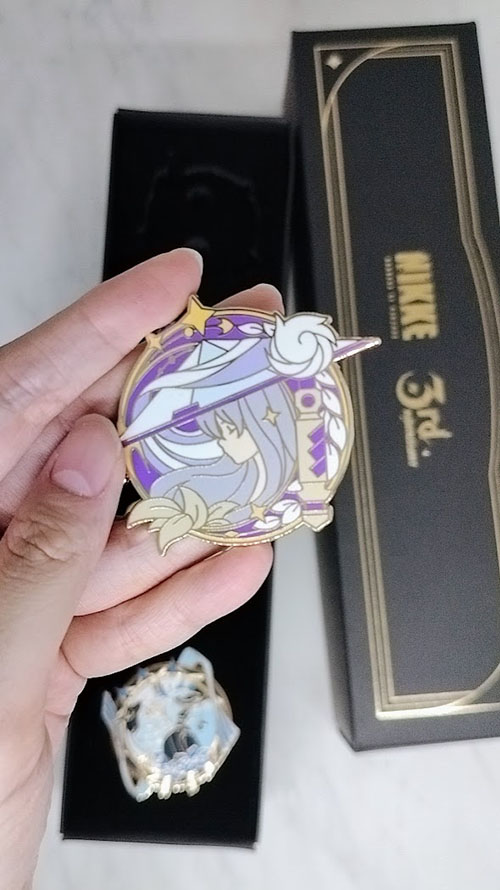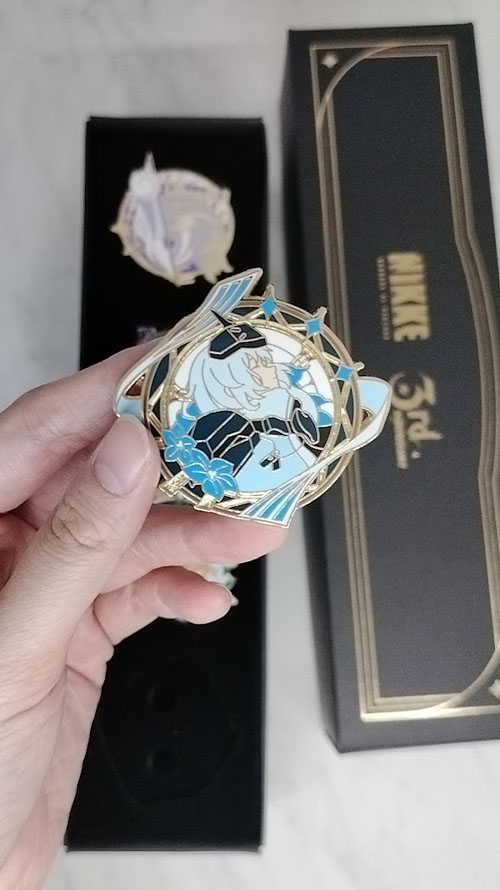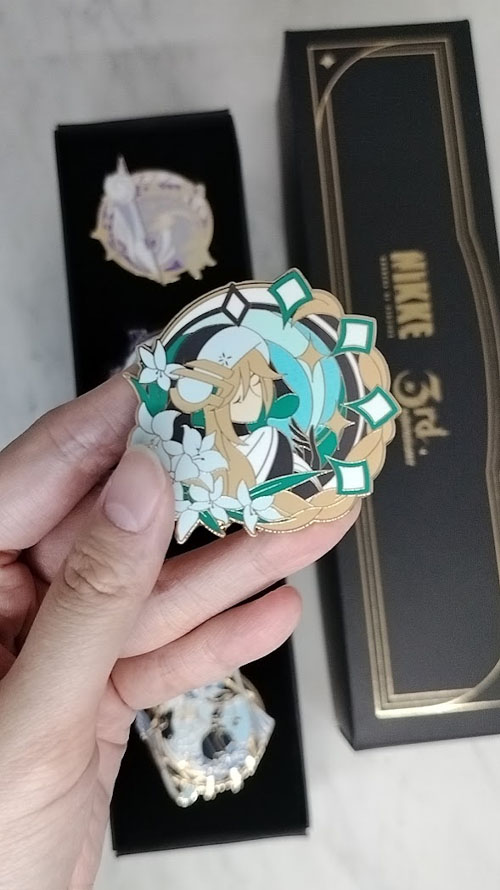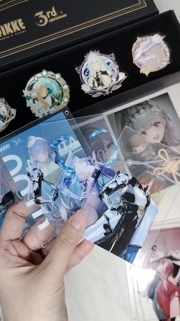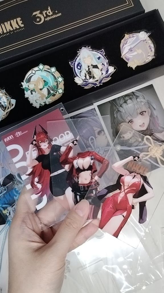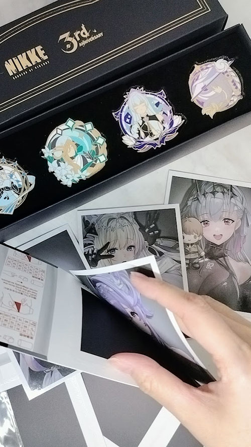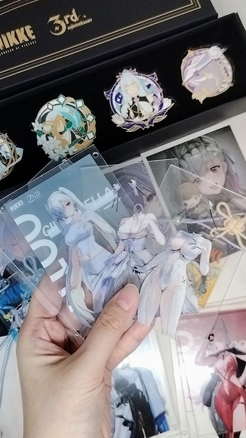 So in this 3rd anniversary Nikke merch package I received different kinds of items – acrylic charms, dress-up acrylic displays, commemorative badge set, and art prints! They all look great!
