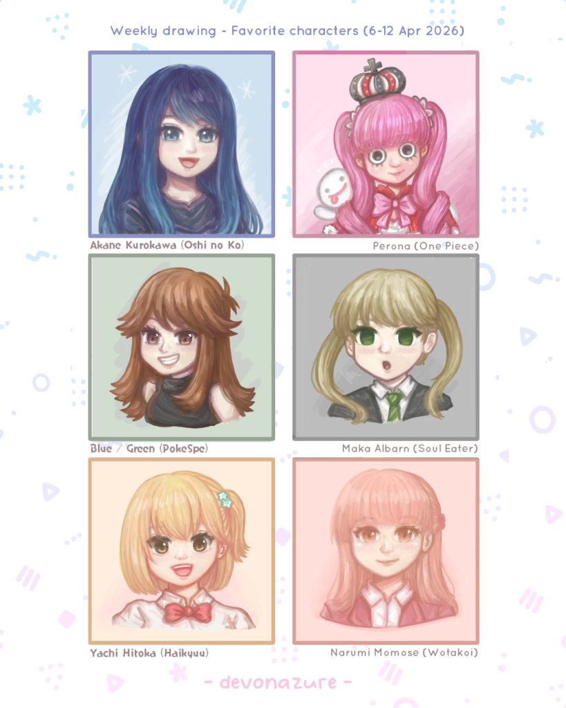 - We choose a random theme for that week – for example, favorite character or favorite drinks. For me, weekly theme keeps me more engaged with the variety than monthly challenges that can make me feel burn out and we try to keep it somewhere being general enough to be flexible to choose what is interesting to draw yet specific enough so we do not think too long on what to choose.