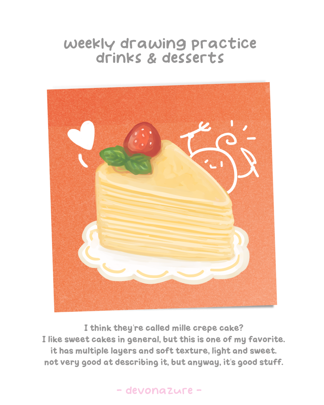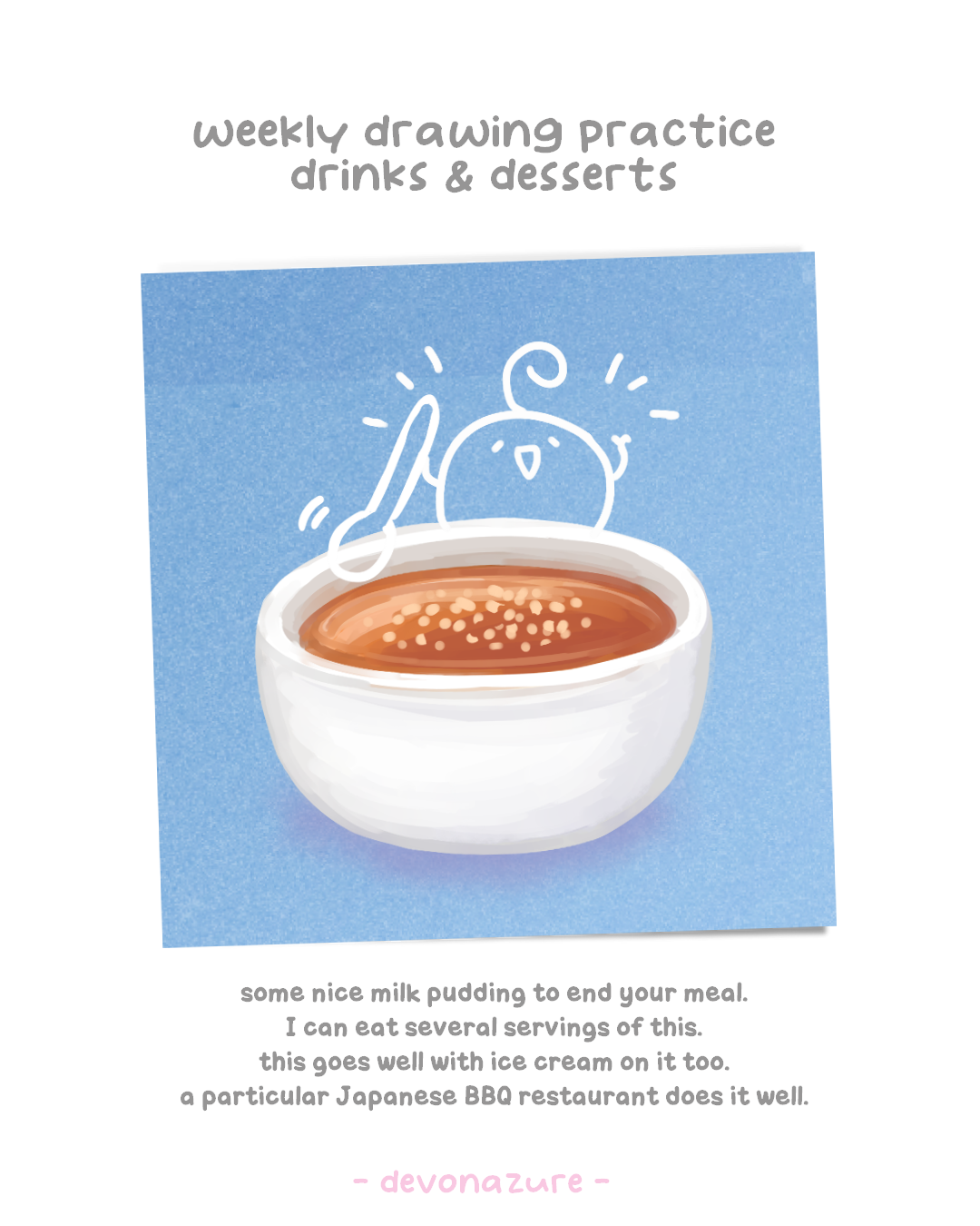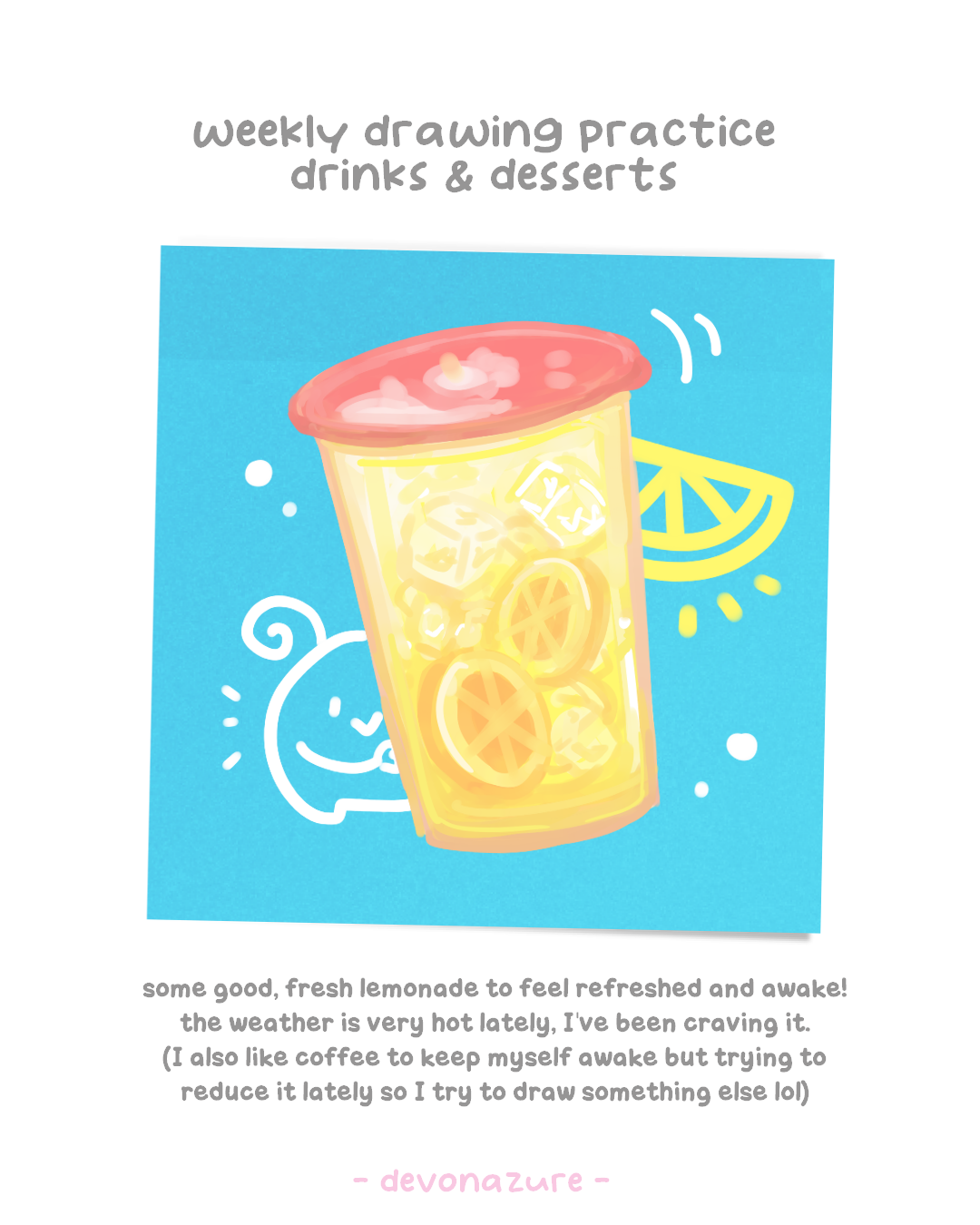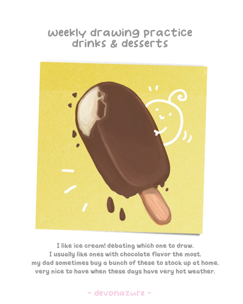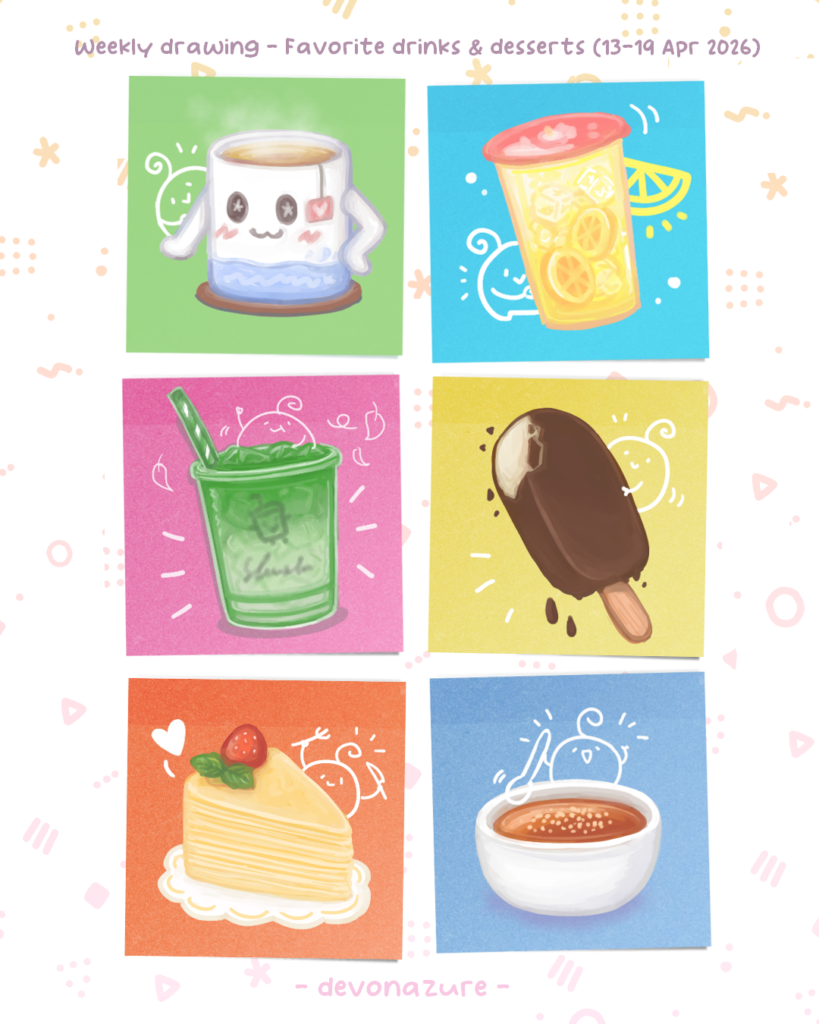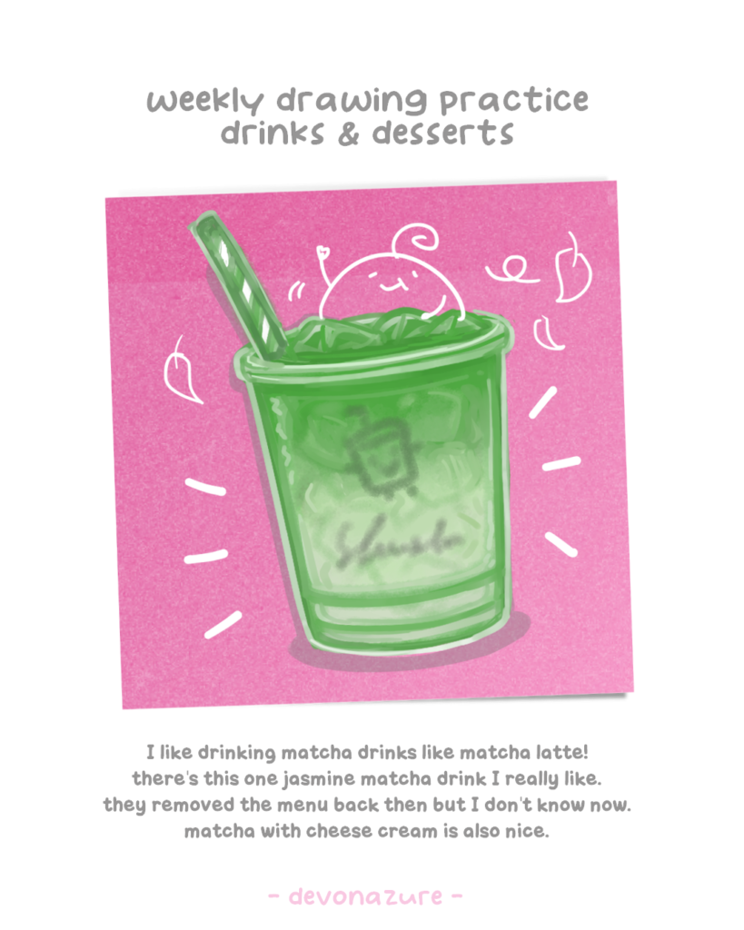 This week was a fun challenge since I struggle with drawing the food texture and liquid visual, so it was kinda frustrating but at the same time it’s also nice to think about what drinks and desserts as idea what to get since the weather is very hot lately.